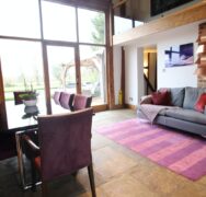 A light room with full length windows either end with exposed timbers and vaulted ceiling. A wide wooden staircase with cupboard under leads to galleried landing above, flagstone floor, three radiators, five windows and opening to the sitting room.