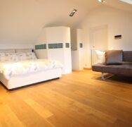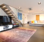 Glazed double doors opening onto the rear terrace and eight windows to the side, part vaulted ceiling, black ceramic tiled floor and under floor heating. Five built-in cupboards, recessed ceiling spot lights and floor level lighting. Open tread wood and stainless steel staircase to first floor.