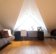 An ‘L’ shaped room with window to front aspect, exposed timbers to two walls, radiator, recessed downlights, oak flooring, access to roof space.