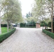 A sweeping gravelled driveway with low box hedging and trees to side line the driveway leading to a large parking and turning area. The remainder of the garden is laid to lawn.