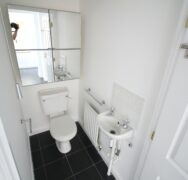 - Downstairs cloakroom – 1.48m x 0.93m – Freshly painted walls and woodwork. White low-level WC & Sink, black ceramic floor tiles.