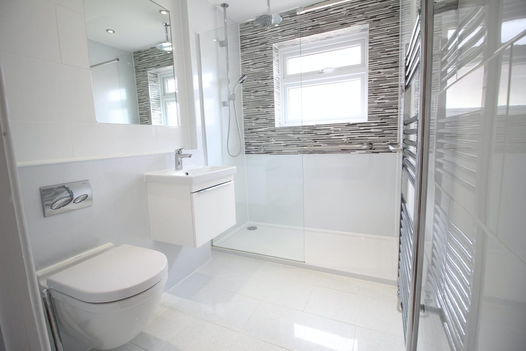 - Stylish family bathroom featuring oversized walk-in shower and premium finishes