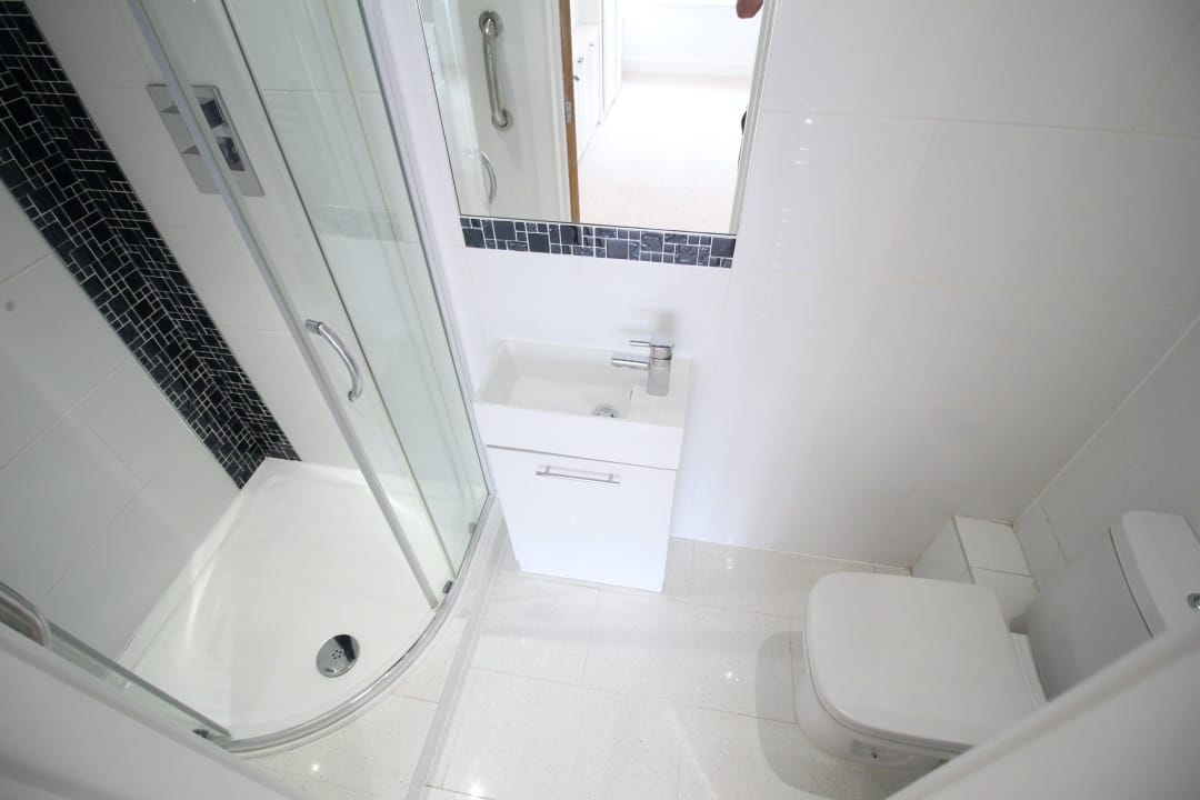 The modern family bathroom features an oversized walk-in shower with glass screen, dual shower fittings, a vanity sink unit, and fully tiled walls and floors for a premium finish.