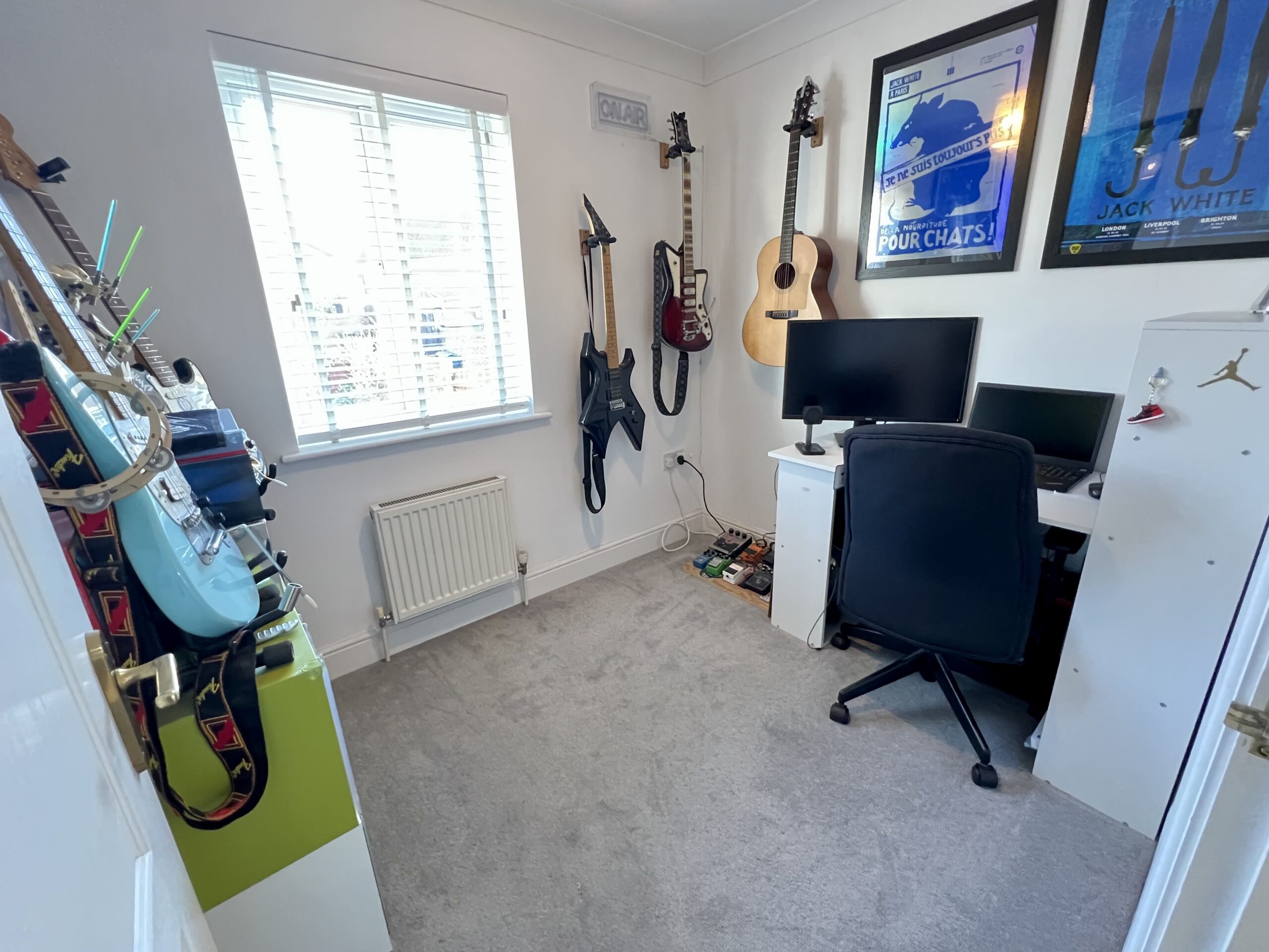 Upstairs, the property offers three well-proportioned bedrooms, including a principal bedroom with its own en-suite shower room and fitted wardrobes. The remaining bedrooms are served by a family bathroom.